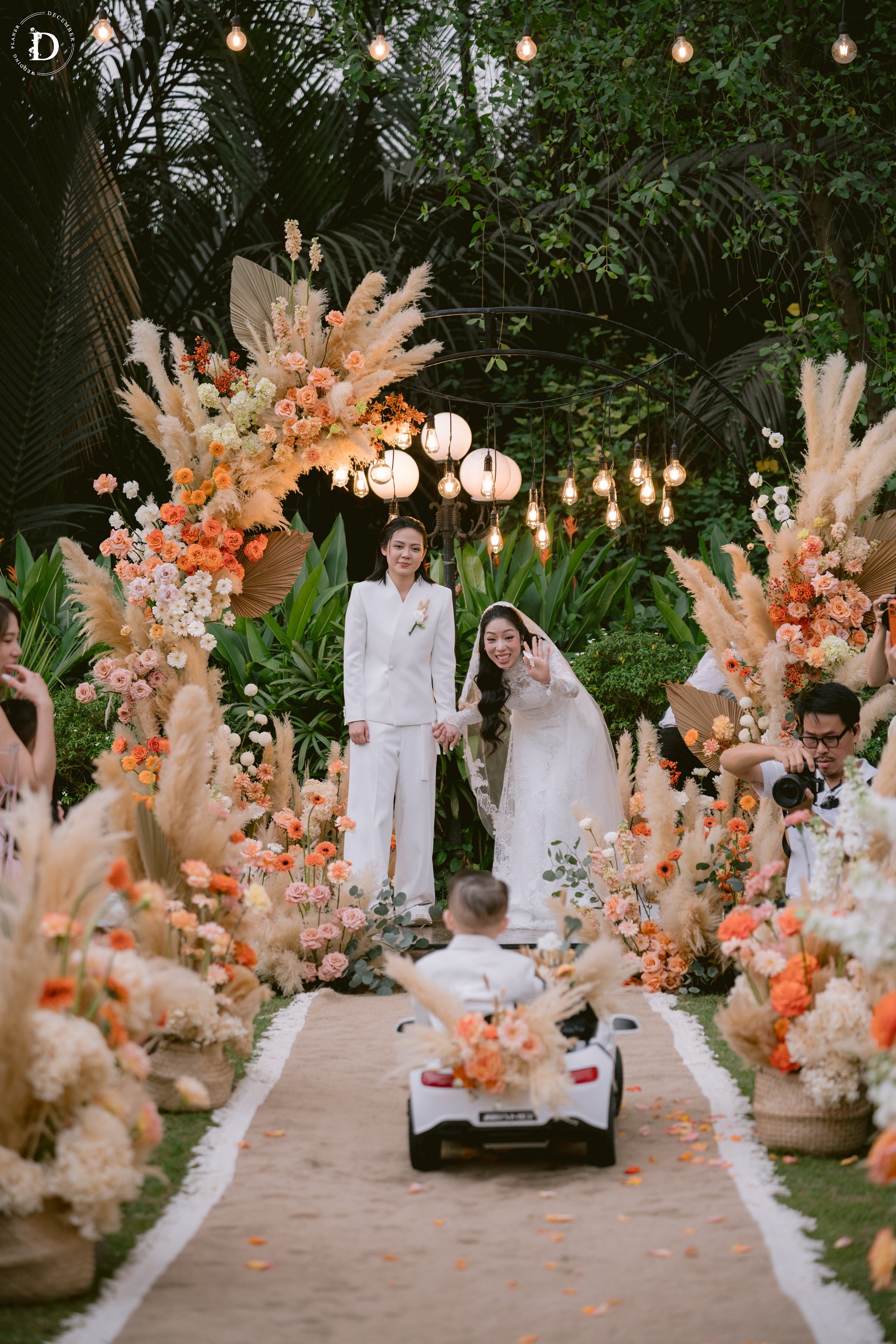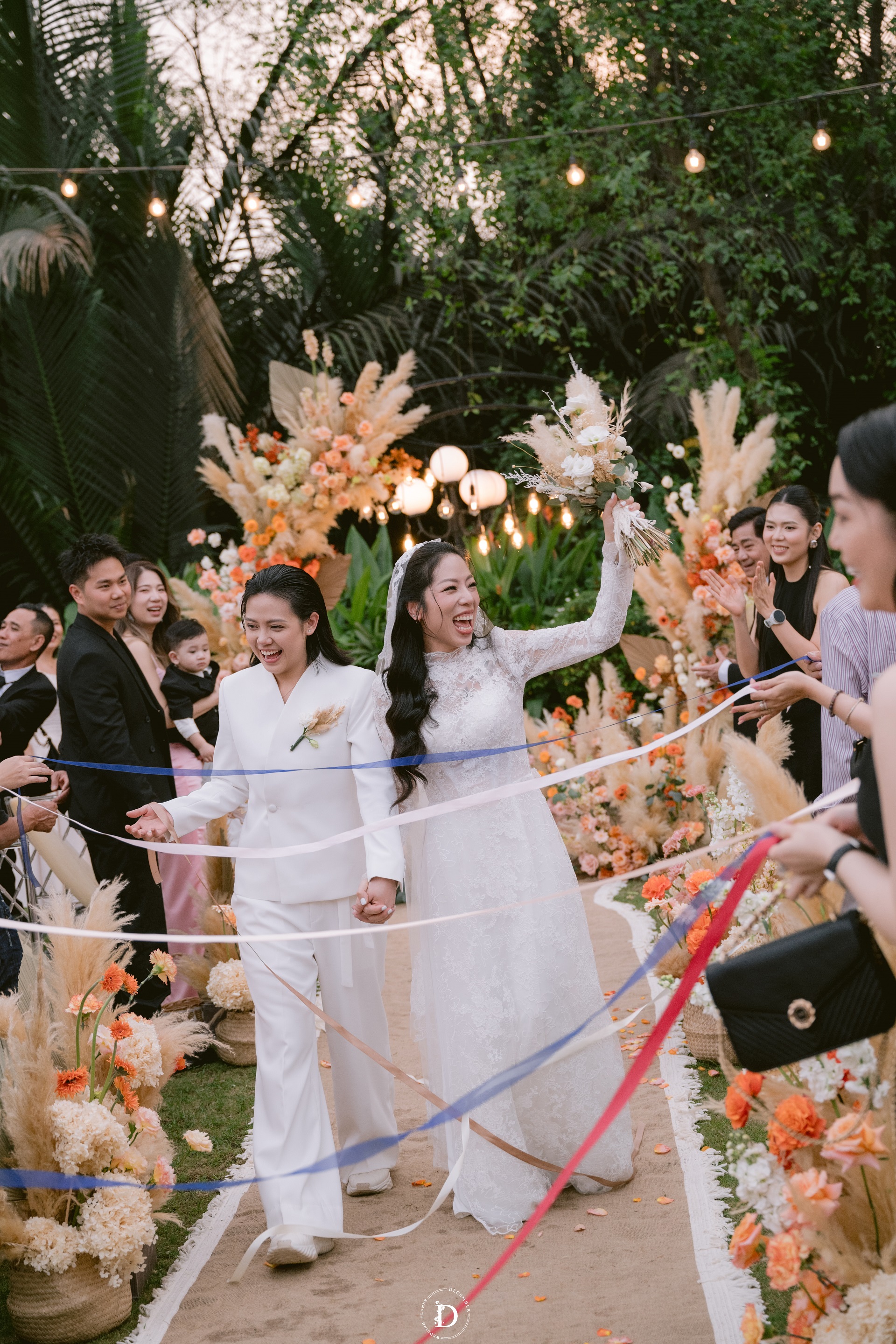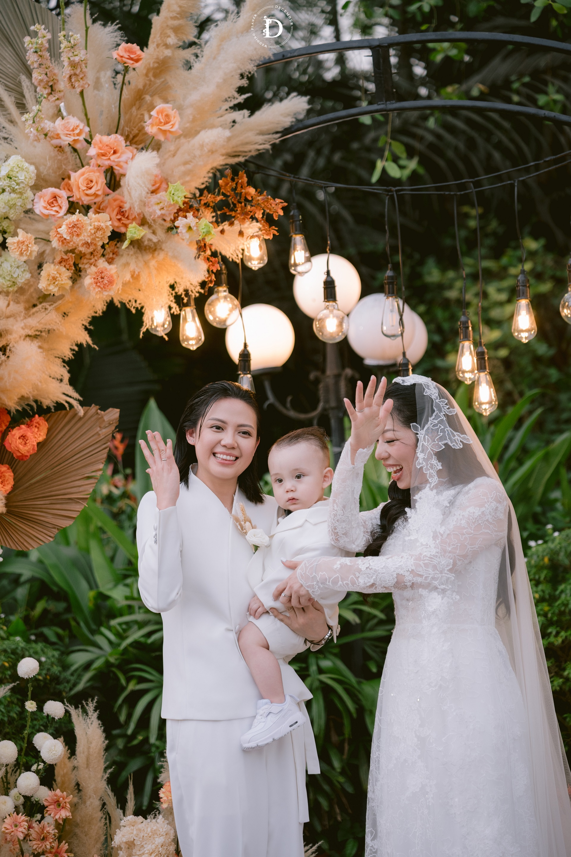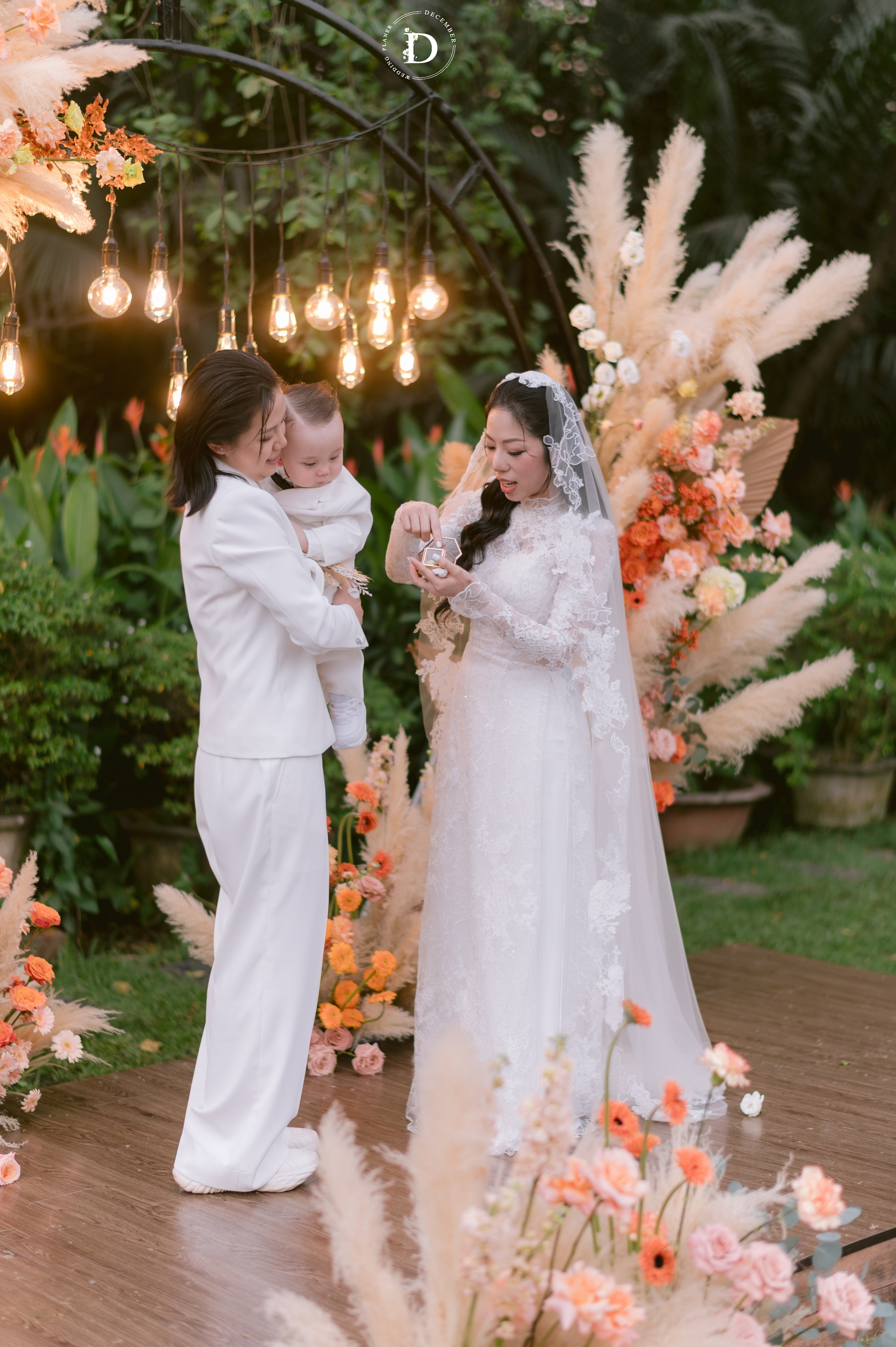 Within that space, the ceremony gradually reached its climax with the first walk moment that was reimagined as a "marathon of love", where guests stood on both sides and held strips of ribbon as if to symbolize each leg of the journey taken together, for the couple to walk through hand-in-hand surrounded by words of blessing and recognition. And when baby Louis, the couple's little angel, appeared with the wedding rings, the painting was made complete: this love no longer belongs only to the two of them, but has now taken the shape of a loving home.
