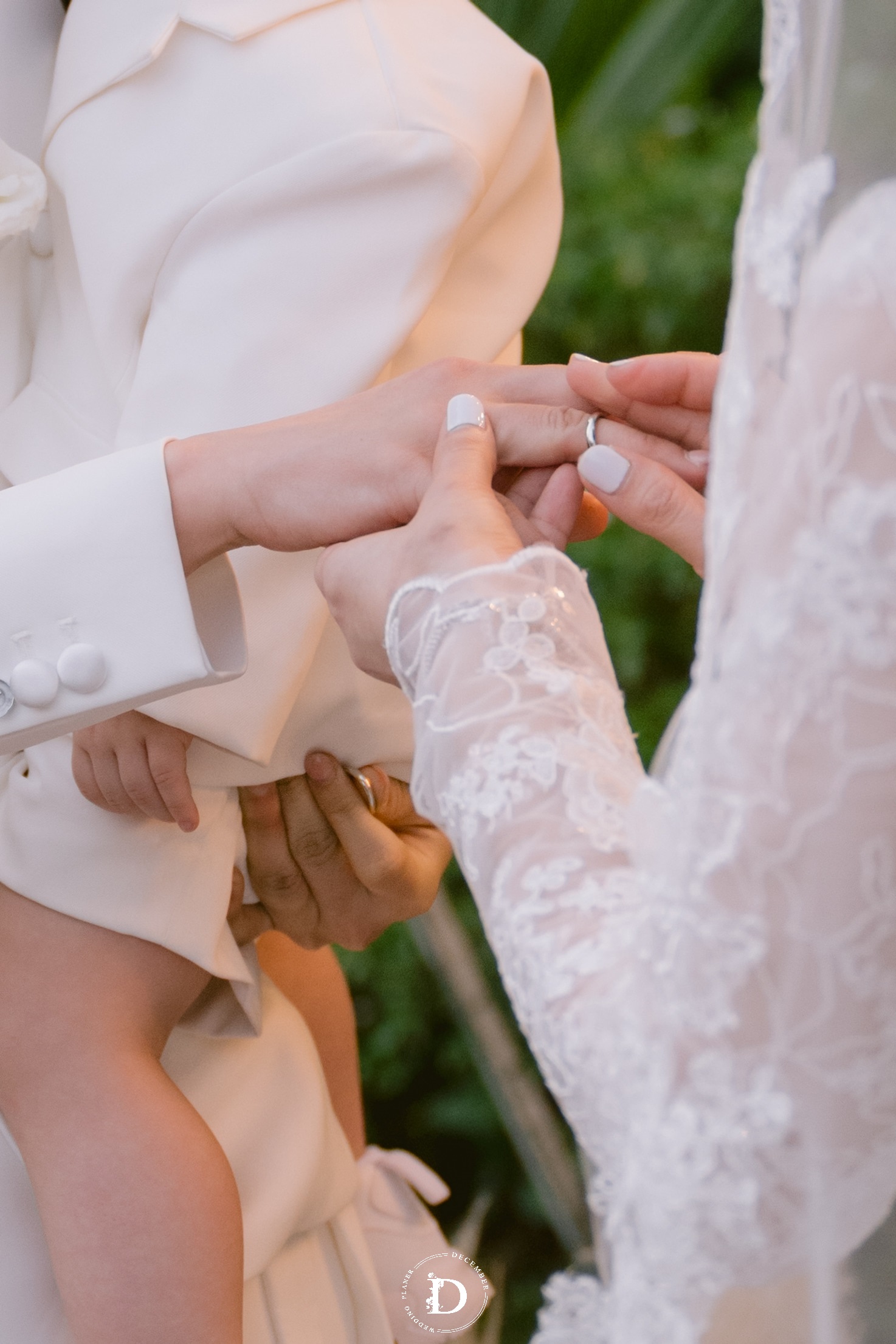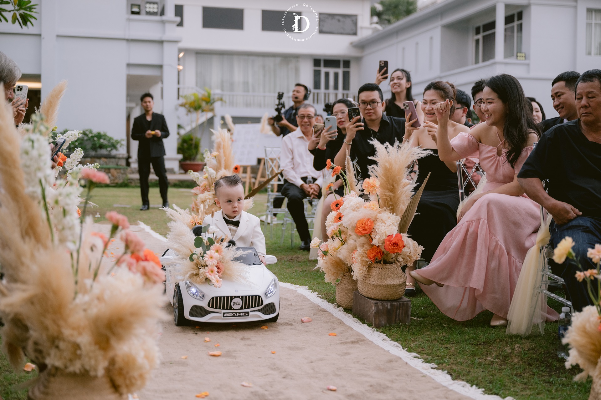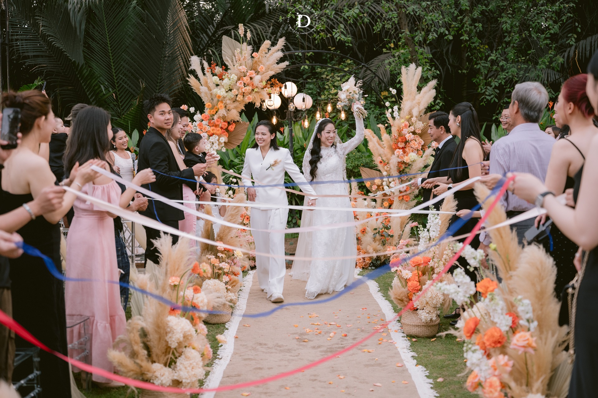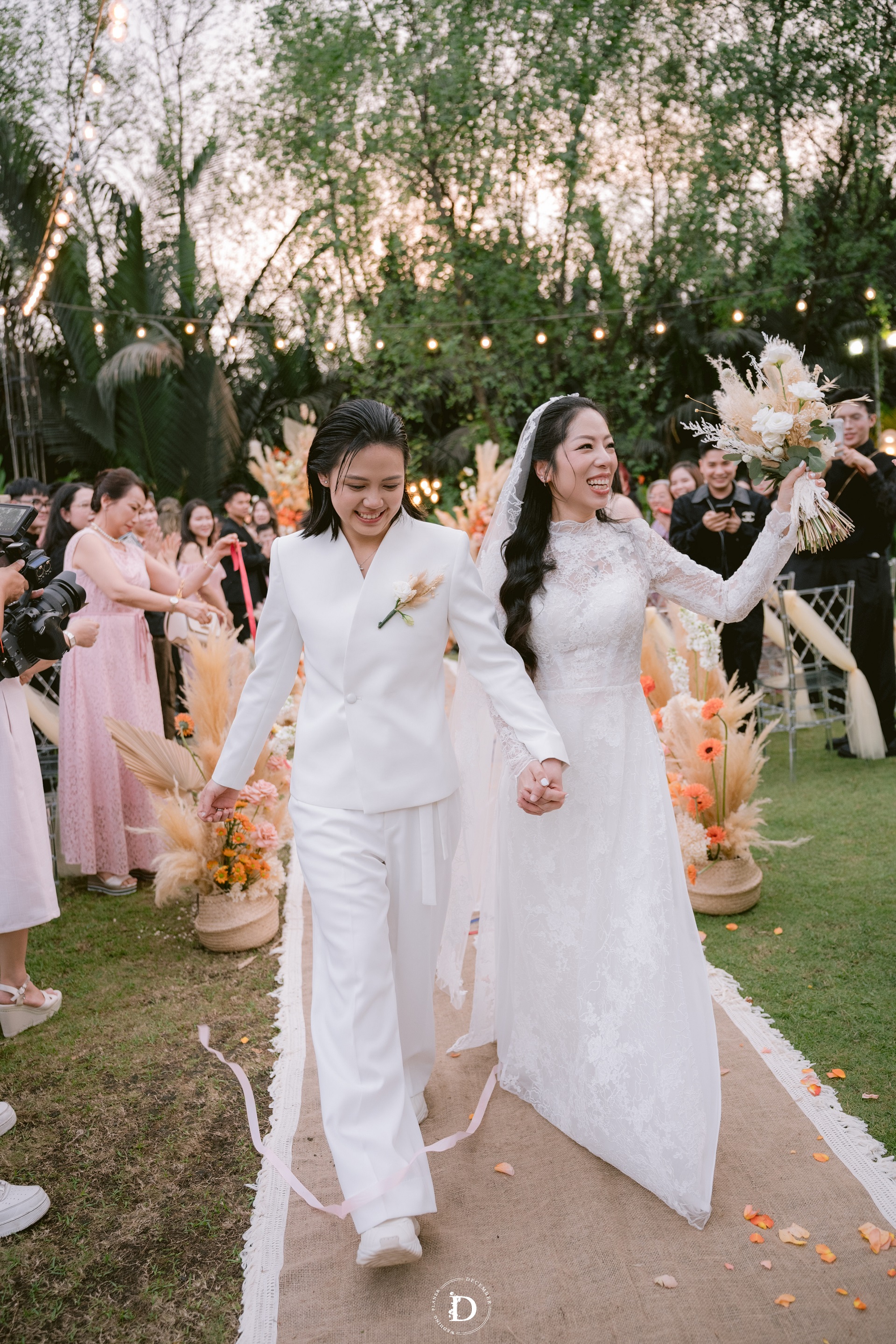 Within that space, the ceremony gradually reached its climax with the first walk moment that was reimagined as a "marathon of love", where guests stood on both sides and held strips of ribbon as if to symbolize each leg of the journey taken together, for the couple to walk through hand-in-hand surrounded by words of blessing and recognition. And when baby Louis, the couple's little angel, appeared with the wedding rings, the painting was made complete: this love no longer belongs only to the two of them, but has now taken the shape of a loving home.