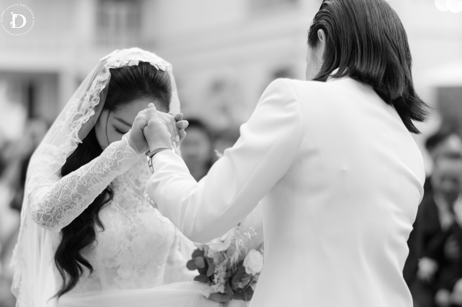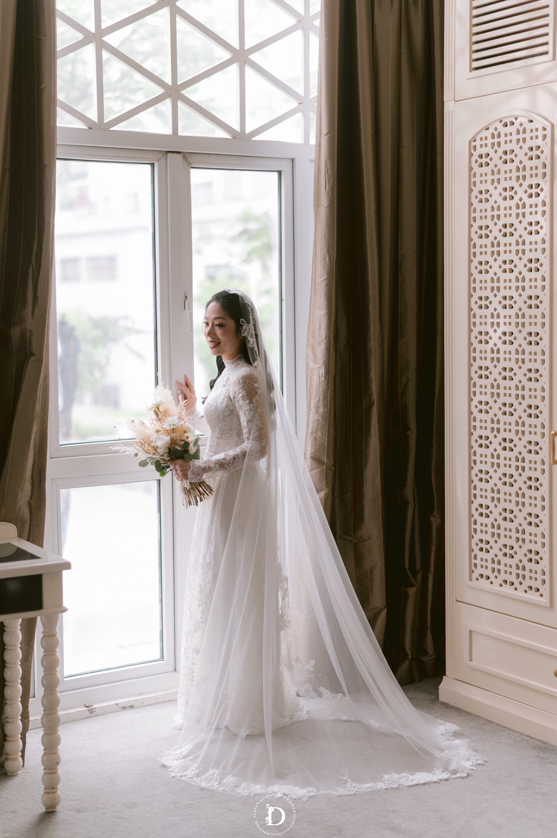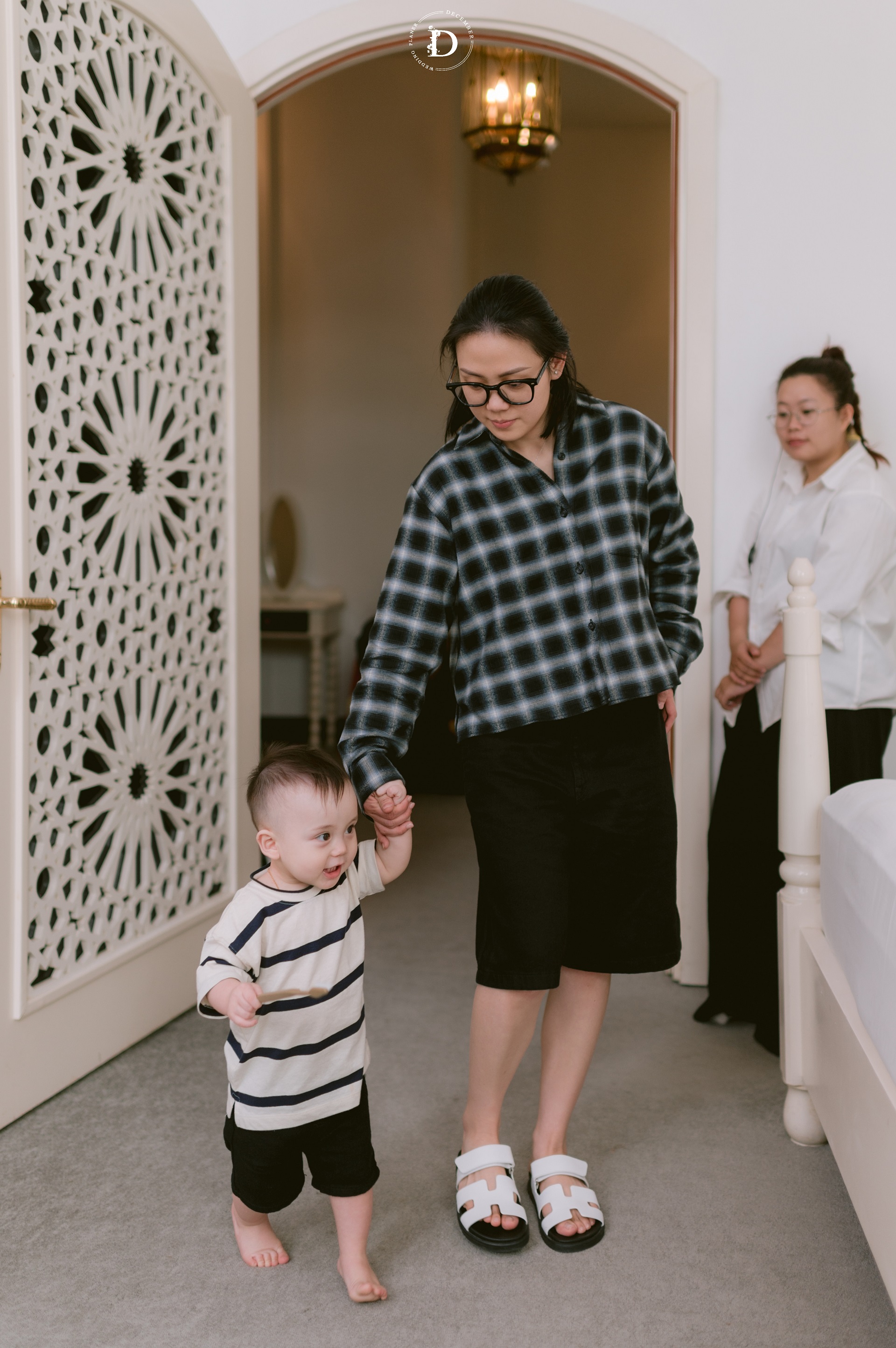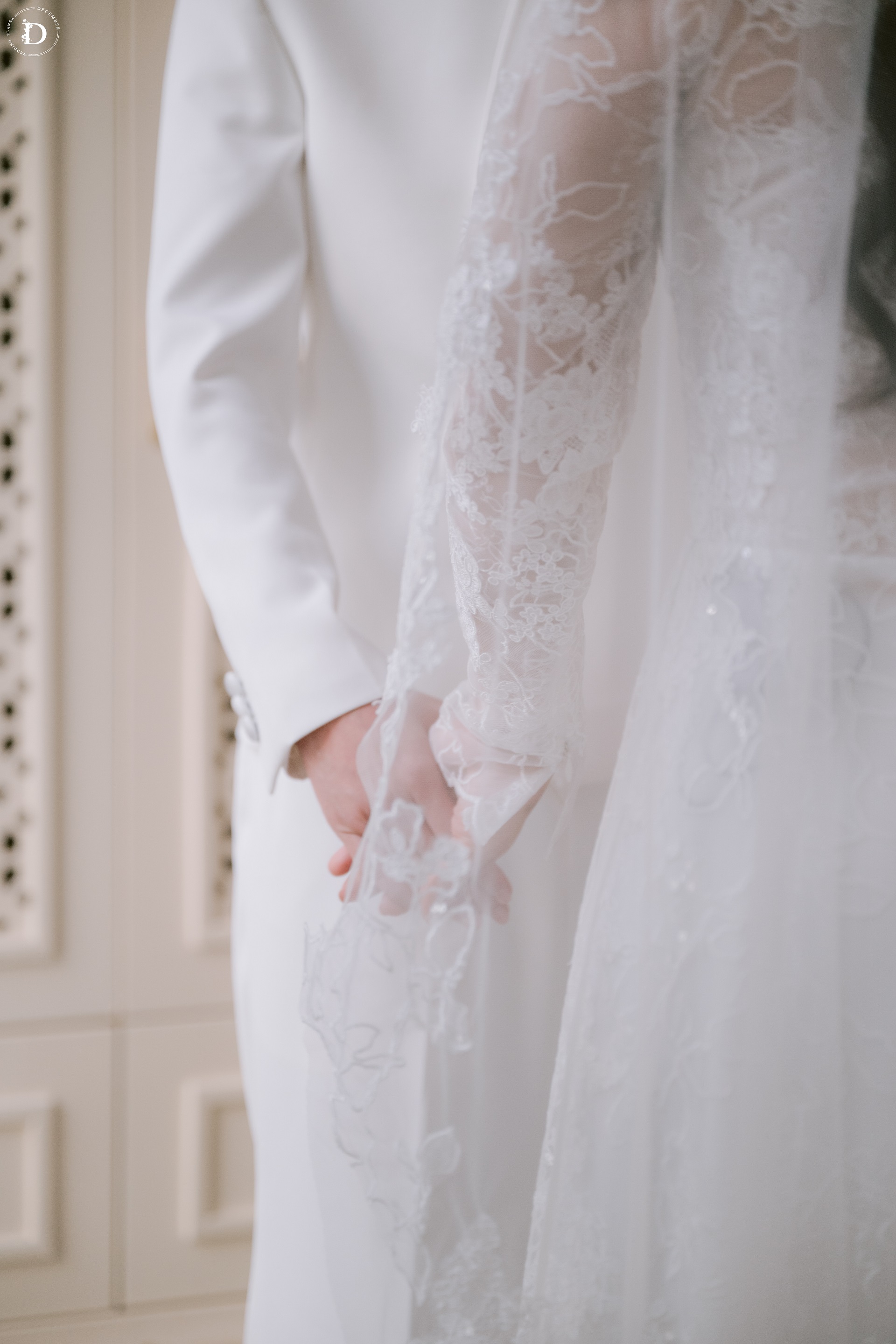 Within that space, the ceremony gradually reached its climax with the first walk moment that was reimagined as a "marathon of love", where guests stood on both sides and held strips of ribbon as if to symbolize each leg of the journey taken together, for the couple to walk through hand-in-hand surrounded by words of blessing and recognition. And when baby Louis, the couple's little angel, appeared with the wedding rings, the painting was made complete: this love no longer belongs only to the two of them, but has now taken the shape of a loving home.