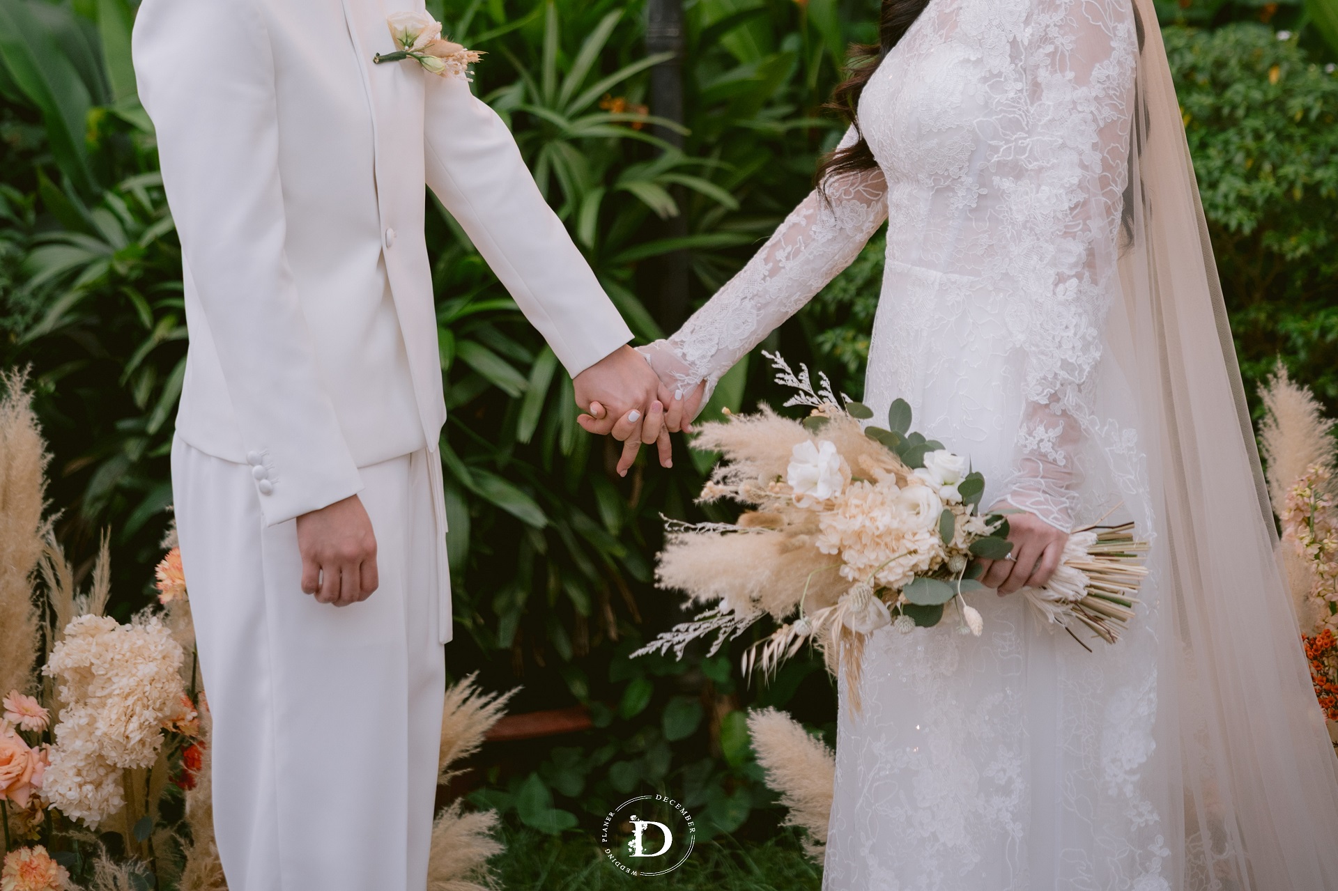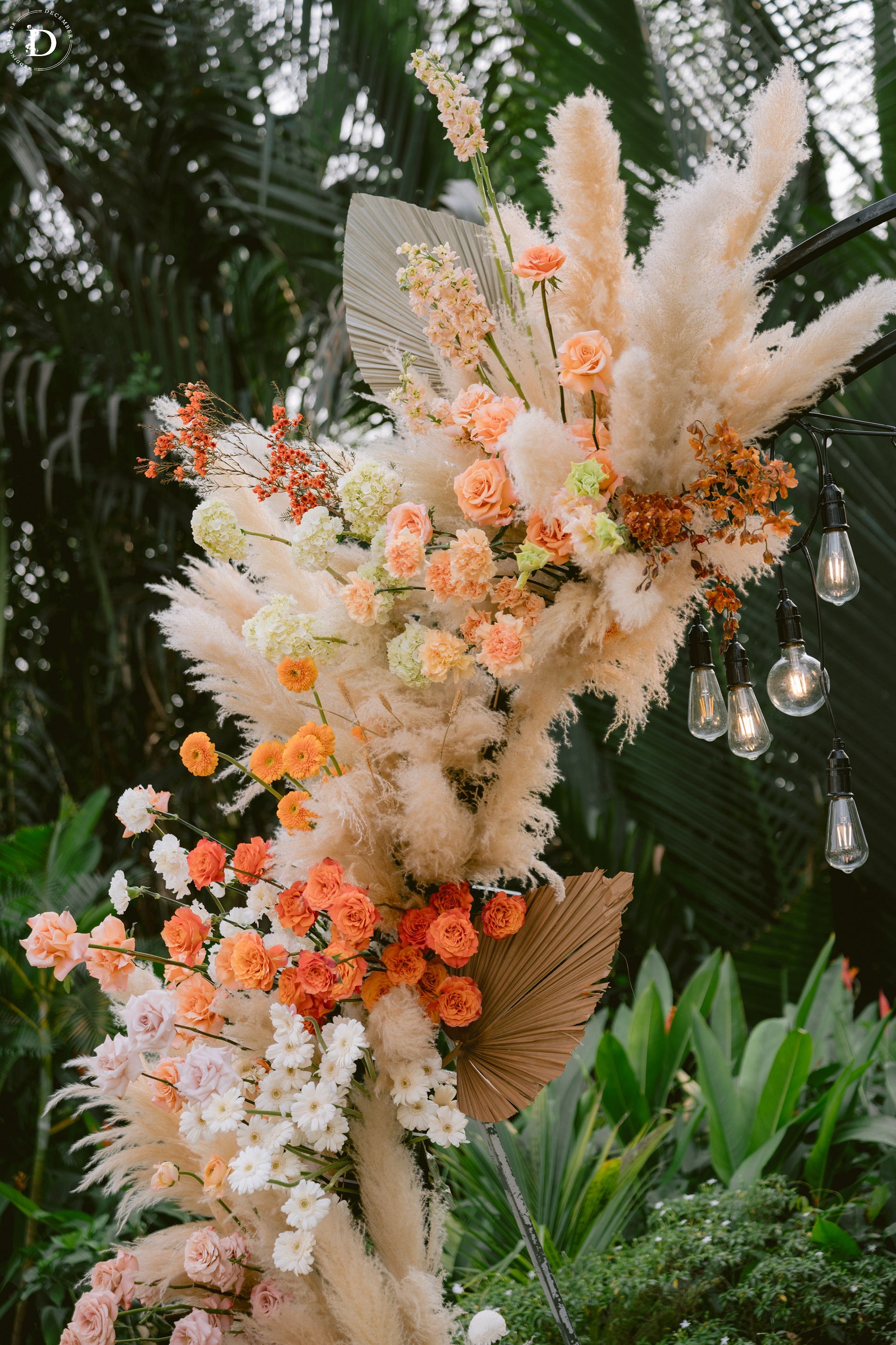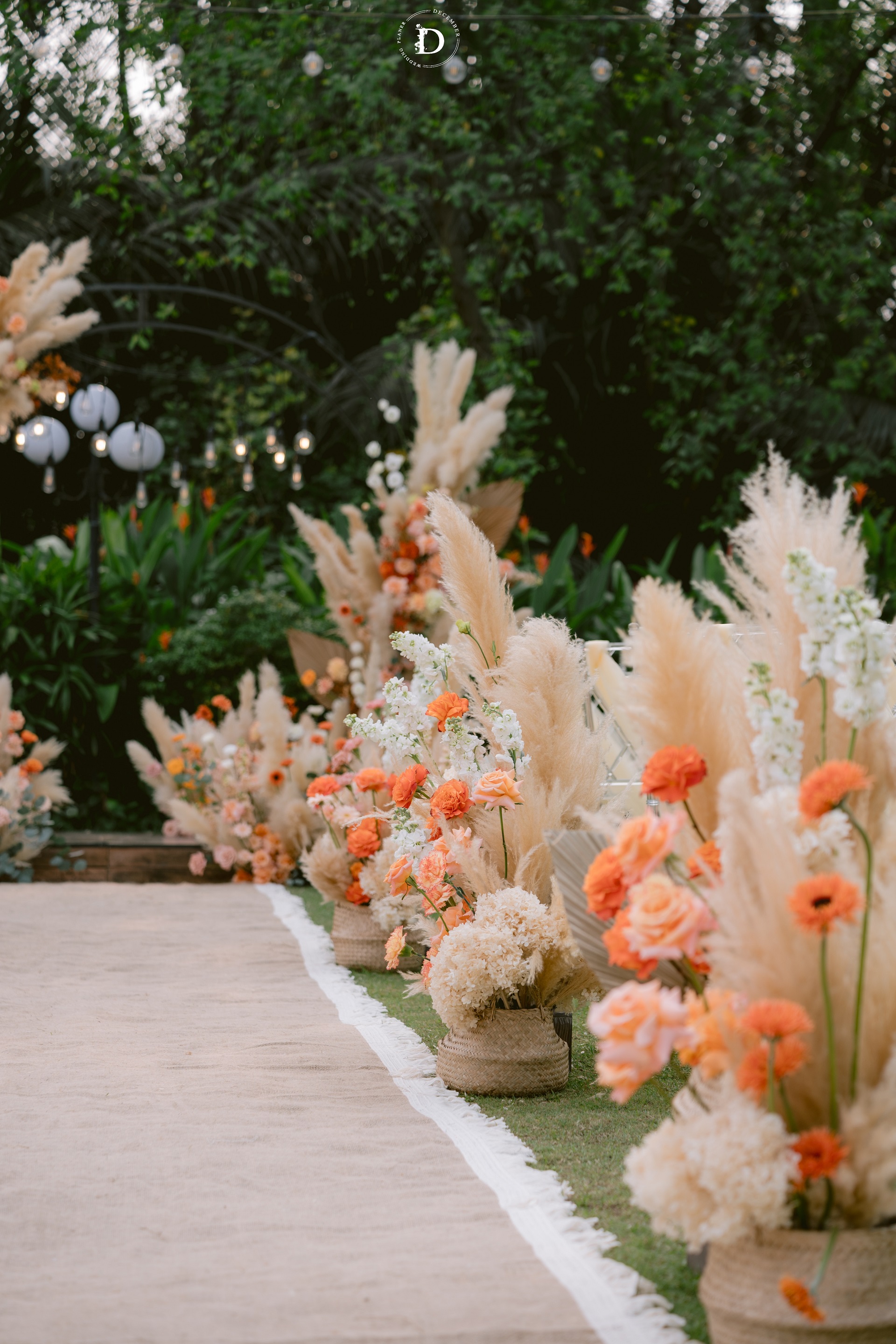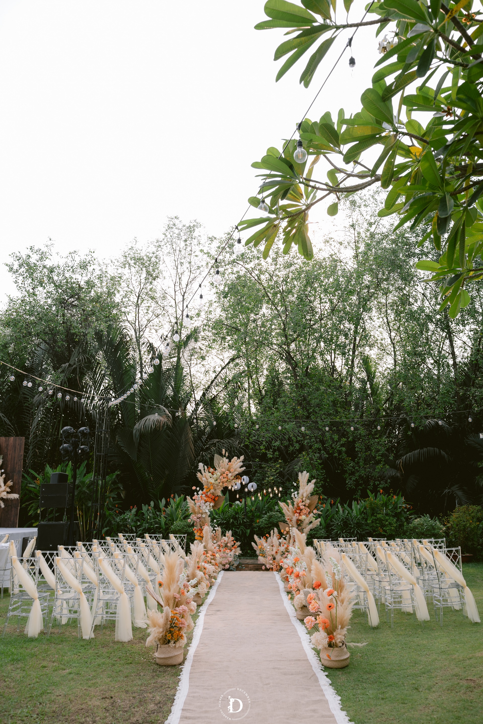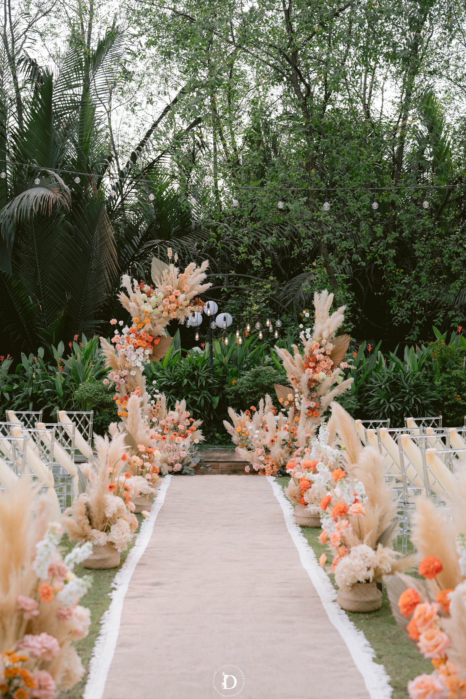 The special day took place in the spacious open air, awash with sunlight and shades of green. The tropical leaves combined with reeds and bouquets of vibrant flowering quinces formed a soft and freeing compositional whole. The ceremony backdrop was also designed to be asymmetrical and without hard frames, letting the foliage "flow" freely with the wind.